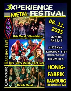 Am 08.11.2025 gibt es hochkarätigen Hair & Glam Metal, 80’s Heavy Metal & Hard Rock und Thrash Metal in der Halle des Kulturzentrums Honigfabrik, Industriestr. 125-131, 21107 Hamburg-Wilhelmsburg: Die Bands siXXXer, Tarchon Fist (Italien / Schweiz) und Cruvior werden mit pulsierender Metal-Energie auf dem 3Xperience Festival Metal die Fans zum Abfeiern, Mitsingen, Mitrocken und Headbangen bringen!