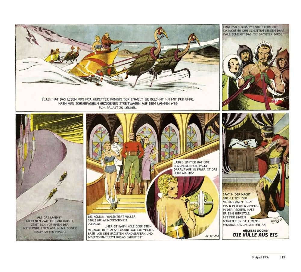 Ming ist immer noch böse und will Flash töten, es kommt sogar zu einer Hinrichtung – ich verrate nicht zu viel, wenn ich schreibe, dass Flash überlebt, muss er ja, sonst gäbe es nicht weitere Stories. Dieses jedoch zeigt, dass es auch einen Untergrund gibt, einen Widerstand gegen Ming. Ist hier schon eine Tendenz erkennbar, dass die Geschichten weniger exotisch, mehr an die Realität angelehnt werden? Dies wird vor allem gegen Ende deutlich, bei den düsterer werdenden Strips von 1941, die einerseits zeigen, wie wichtig die Technik(er) für das Leben auf Mongo ist / sind, andererseits wirkt hier Mings Unerbittlichkeit greifbarer, realer. Band zwei endet gar mit der Aussage, Zarkov wäre in ein Konzentrationslager gebracht worden. Das lässt dann an irdischen Schrecken der damaligen Zeit denken.