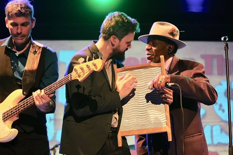 Nicht nur einmal nahm der Bandleader quasi hautnahen Kontakt zum Publikum auf. Fred Barreto ließ die Dobro gleich geschultert und Schlagzeuger Yves Ditsch hatte die Zeit genutzt, um für "90 Days" Fingerhüte aufzusetzen und sich mit einem Washboard auf den Weg zu seinen Band-Mates zu machen. Klar, mit einem solchen Instrument und der Dobro trat der Country Blues in seiner flott gespielten Art in den Vordergrund.