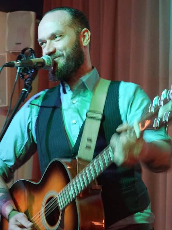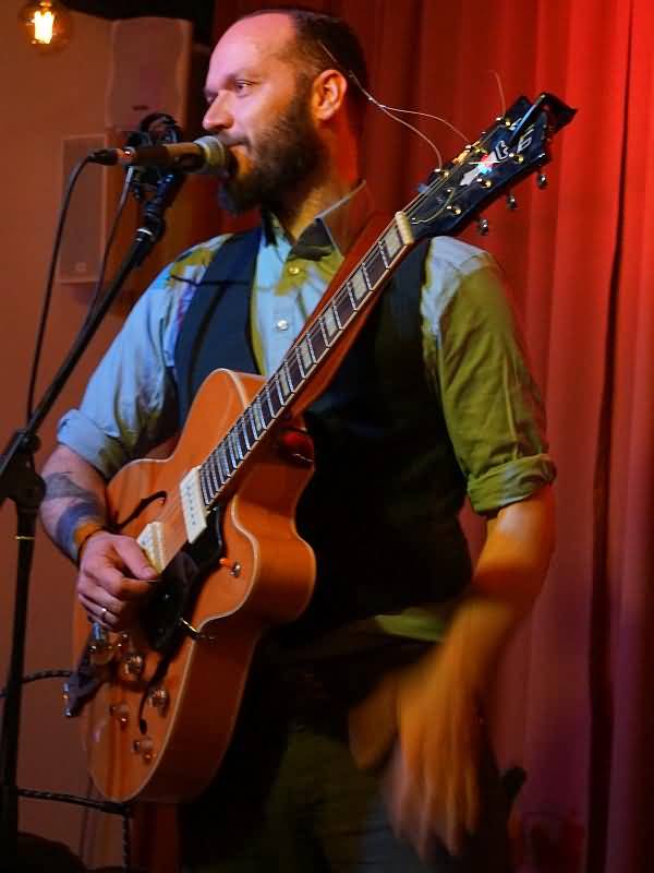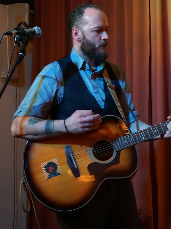 Okay, Baby Kreuzberg ist zwar ein Bandprojekt, aber erwartungsgemäß war Marceese Trabus an diesem Winter-Abend alleine aufgetaucht, um seine Songs vorzutragen. Was aber gar nicht schlimm war und wenn ein Laden für so etwas wie gemacht ist, dann ist es Mandy’s Lounge. Was folgte, war eine bunte Zusammenstellung von Songs aller Projekte, die der Mann am Start hat. Neben einigen sehr amüsanten Tracks des Kinder-Albums, des aktuellen Baby Kreuzberg-Werkes sowie Songs aus dem sehr starken A-Ramblin' And A-Howlin' kamen dann auch bereits Stücke der Band Yer International Humbug wie "Another Brick In The Wall, Part 2" oder "Eclipse" zum Einsatz. Der erstgenannte Titel ist natürlich ein Pink Floyd-Cover, allerdings sehr eigenwillig und interessant interpretiert und "Eclipse" geht fast schon ins Psychedelische, da bin ich bereits sehr auf die Studioversion gespannt. Der Protagonist wechselte fließend von seiner akustischen zur halbakustischen Guild-Gitarre und wieder zurück, setzte zeitweise sogar sehr heftige Verzerrungen ein, während er seine melodiereichen und eingängigen Lyrics zum Besten gab.