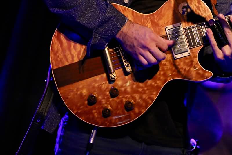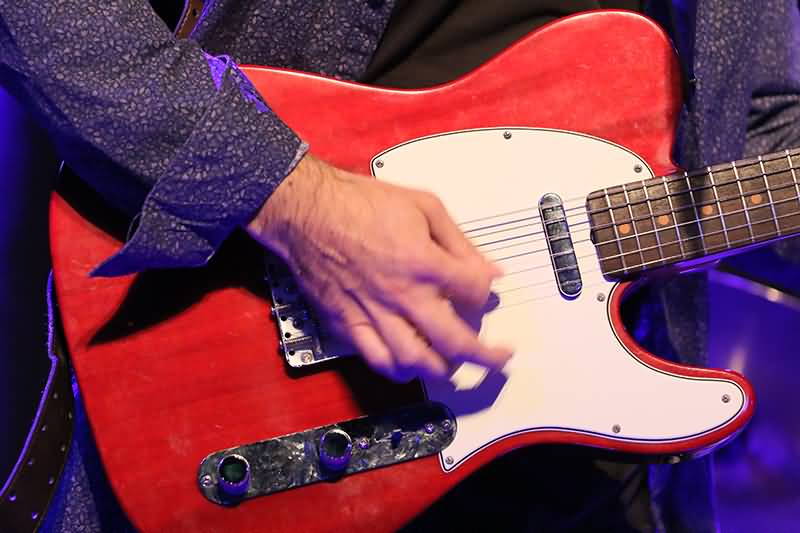 Niklas Scharges Leidenschaft auf der Gitarre mündete in nicht wenigen tollen Soli, die er durch viel Inspiration und Feeling zum Ausdruck brachte. Für die Stücke "No Money In My Pocket" sowie "Finish Line" wechselte er die E-Gitarre und streifte das Bottleneck über seinen Ringfinger. Klar, der spezielle Slide-Sound kam besonders gut an und ganz allegemein spielte der Frantmann bemerkenswert gute Soli. In letztgenanntem Track zauberte Peter Niemeier ein fantastisches Percussion-Solo mit viel Latin-Flair.