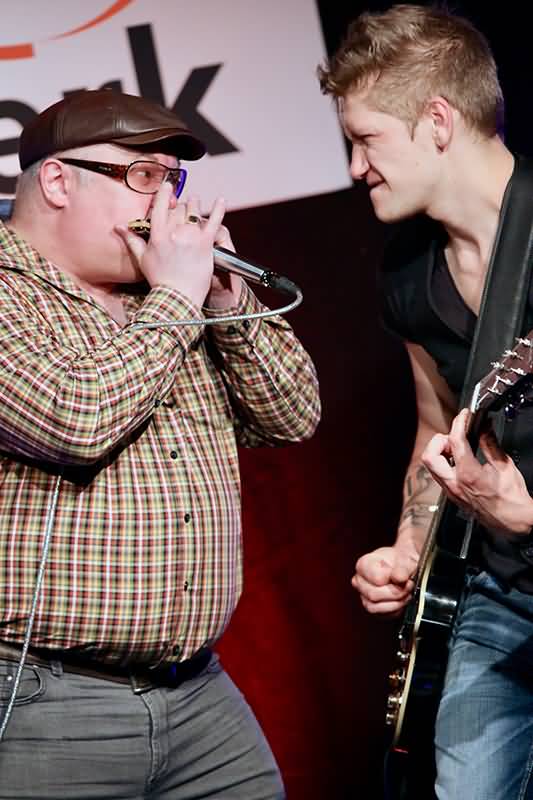 Für den ersten Slow Blues griff Chris Kramer zu einer blau gefärbten chromatischen Harmonica. Der spezielle Klang dieses Mississippi-Saxofons verursachte eine Gänsehaut und als er die wohl tiefsten Töne auf diesem Instrument intonierte, klang es wie ein gestrichener Kontrabass. Von nachdenklich bis furios spannte der Harper ein immenses Dach über sein Spiel.