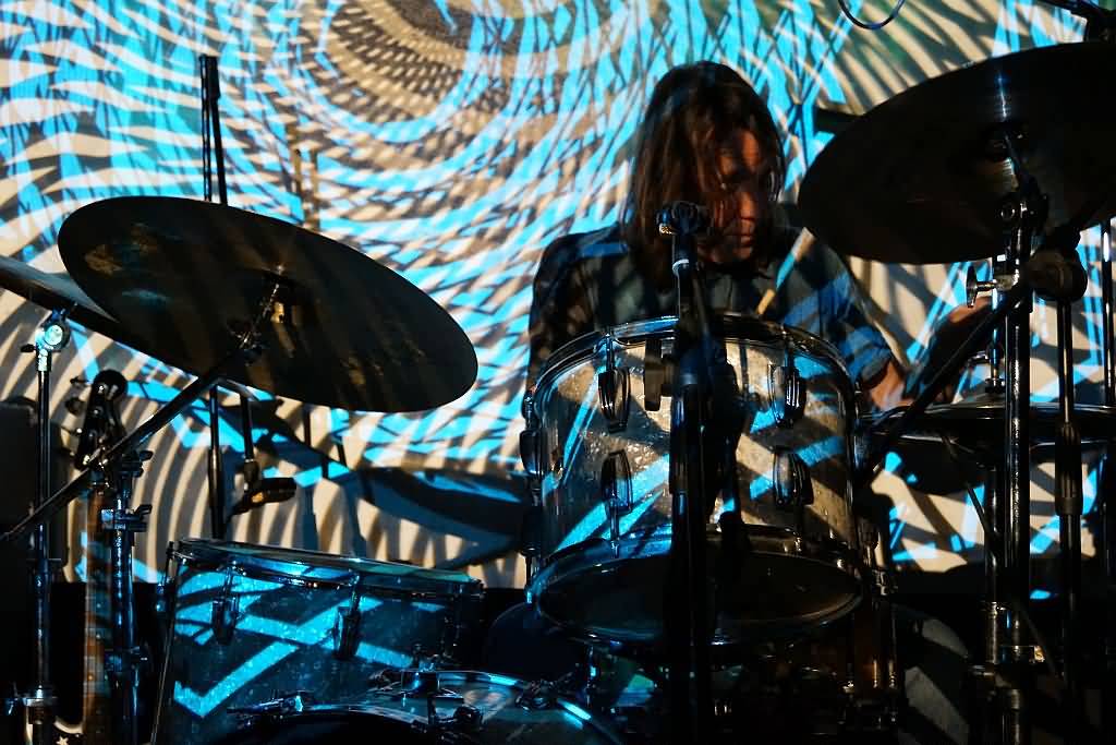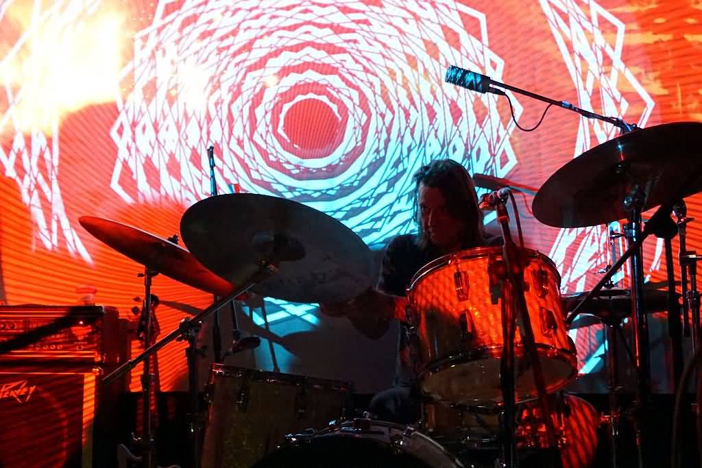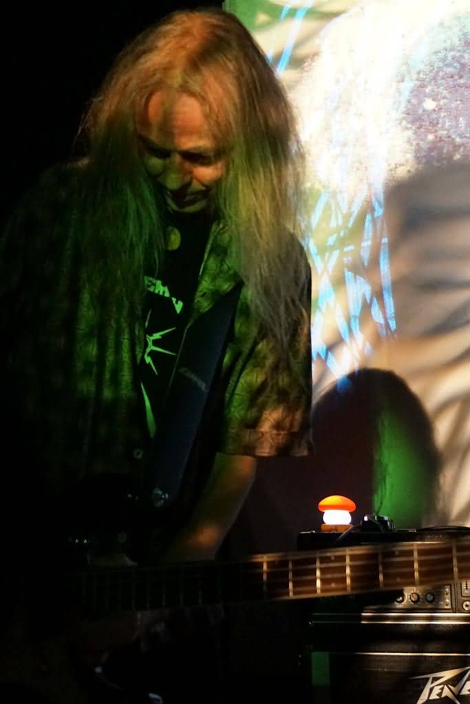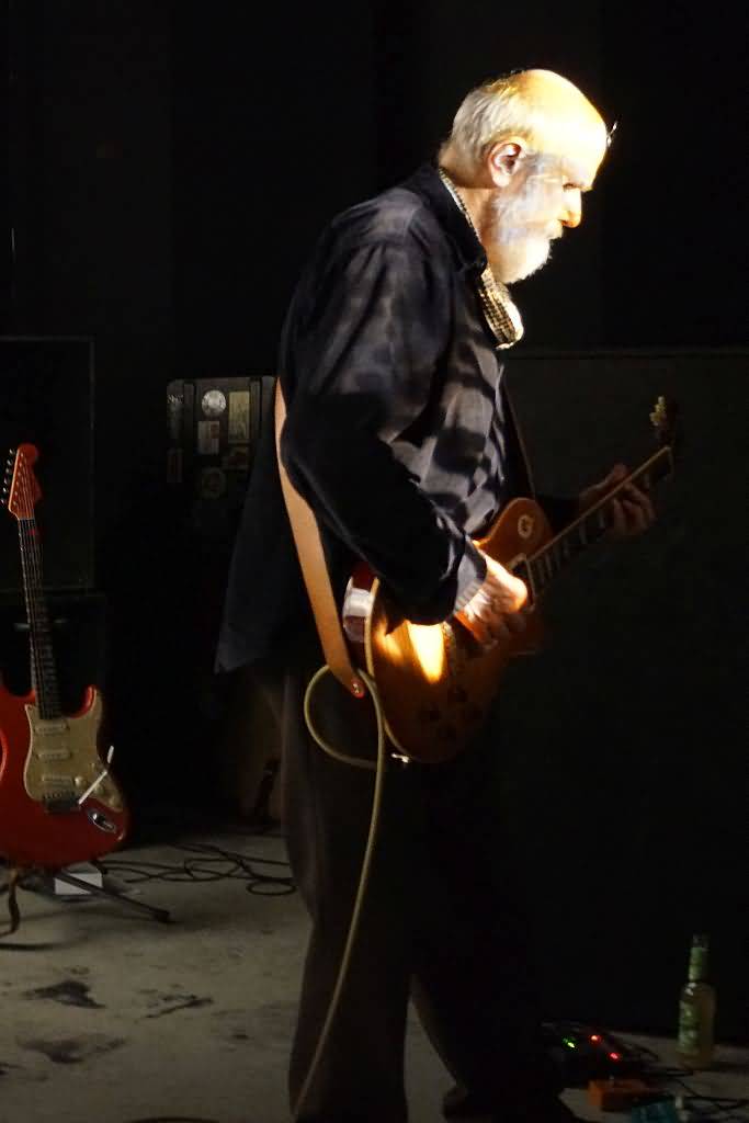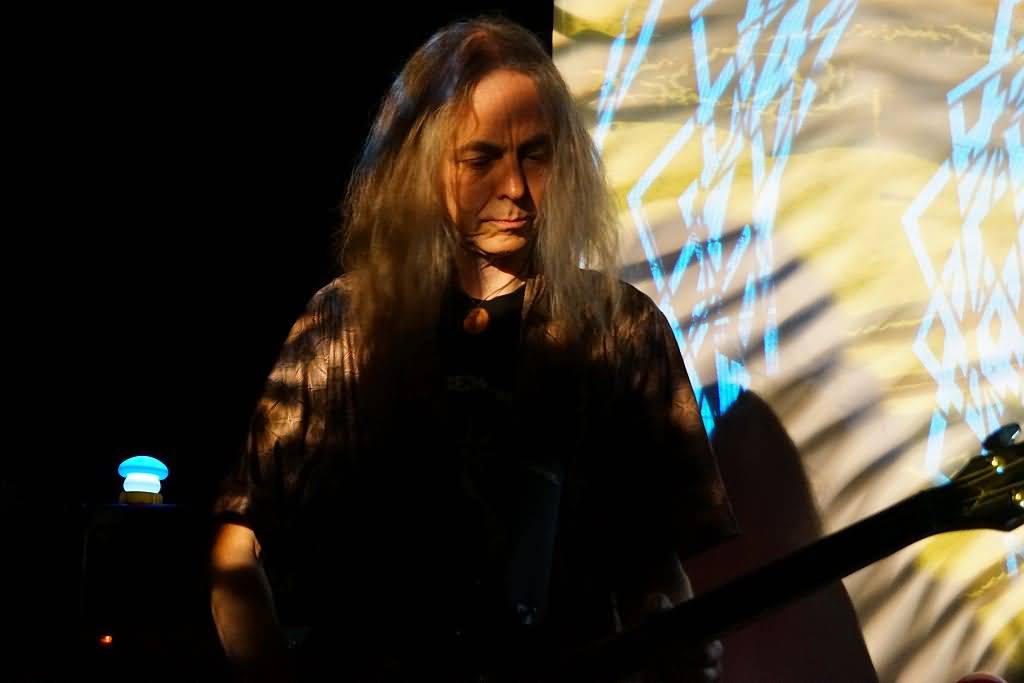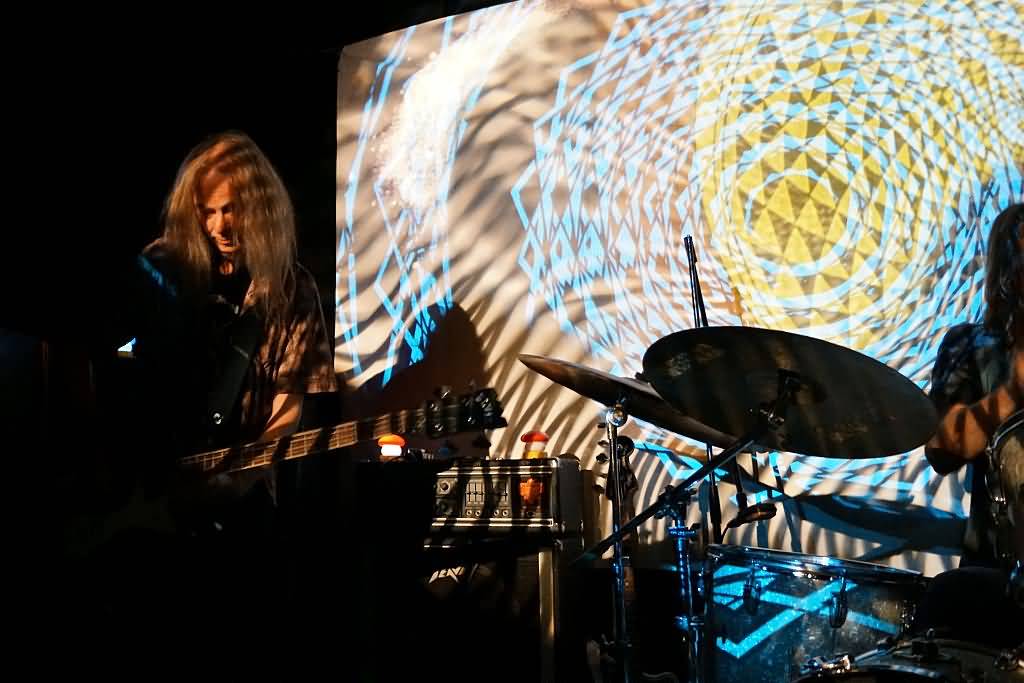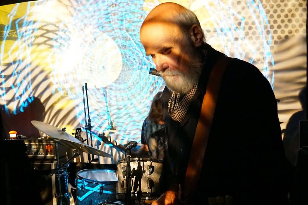 Es war das erste Mal, dass sich dieses neue Projekt gemeinsam auf einer Bühne einfand und zu unserem Erstaunen stellte sich in Gesprächen mit Genrich und Schmidt vor dem Gig heraus, dass die vier Musiker auch überhaupt nicht geprobt, sondern beim Soundcheck am Nachmittag zum ersten Mal überhaupt miteinander gespielt hatten. Aber gut, wir haben es hier mit erfahrenen Vollprofis zu tun, bei denen es lediglich noch darauf ankam, ob und wie gut sie gemeinsam auf einer Bühne miteinander klar kommen. Nach und nach trudelten dann auch immer mehr Gäste ein und als die ersten Töne, übrigens sehr cool von einer psychedelischen Projektor-Light Show unterstützt, erklangen, war der Konzertraum doch sehr gut ge-, glücklicherweise aber nicht überfüllt. Klar war, dass hier keine Songs im eigentlichen Sinne kommen, sondern eine improvisierte Session stattfinden sollte, die sich dann als mehrere lange Jams herausstellte. Auf Gesang wurde übrigens komplett verzichtet, was sich aber, wie die kommenden knapp zwei Stunden bewiesen, keineswegs als Nachteil heraus stellte. Free Flow war angesagt und nach der Bass-Einleitung Schmidts stiegen nach und nach auch Conni Maly, Steff Bollack und Ax Genrich in die erste, noch etwas relaxtere, Nummer ein.