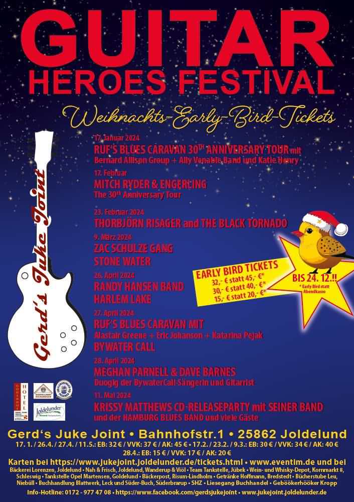Liebe Freunde der elektrisierenden Saitenklänge mit jeder Menge Dampf, Gefühl, Blues, Rock (’n' Roll) & Soul … es dauert nicht mehr lange und es rappelt wieder ein Wochenende lang nicht im Karton, sondern auf Deutschlands musikalischsten Heubodenumbau biegen sich die ehrwürdigen Holzbalken zu den Klängen von der Randy Hansen Band, Harlem Lake, Rufs neuestem Blues-Caravan Streich und Bywater Call. Von letzterer Kapelle dürfen die großartige Sängerin Meghan Parnell und Gitarrist Dave Barnes abschließend zum sonntäglichen Frühschoppen die Gemüter und Holzbalken unplugged beruhigen.