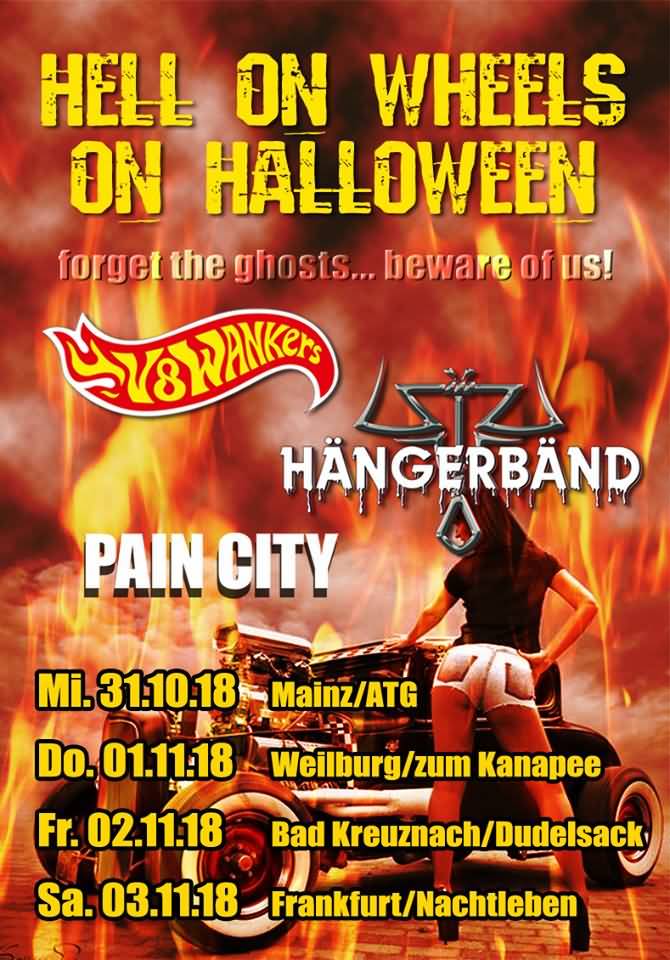 Dass die Hängerbänd an Halloween im Alexander The Great spielt, ist eine seit Jahren gepflegte Tradition. Dass sie zwei Tage später im Dudelsack dudeln war bisher auch schon bekannt. Doch 2018 gibt es eine kleine Tour unter dem Motto 'Hell On Wheels On Halloween' (Untertitel: Forget the ghosts – beware of us!). Das klingt nicht nur lustig, sondern kann sogar mit einem etwas bekannteren Namen aufwarten: V8 Wankers aus Offenbach. Als Dritte im Bunde dabei: Pain City.