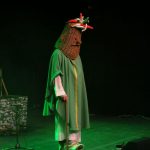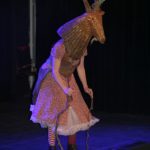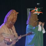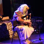 Gut, anders kann es dann aussehen, wenn selbst solche Songs sozusagen verkleidet werden und damit auch eine gewaltige Dramatik ausstrahlen. So geschehen durch den zweiten Act des Abends, durch die Armagh Rhymers, eine Band aus Musikern und Schauspielern, dieses Mal zu viert angetreten. Und hier war dann eine Sängerin dabei, die genau das Gegenteil von Bernie Phaíd war, total agil, mit starker Präsenz, frech im Ausdruck und mit vollem Stimmumfang, sehr kraft- und druckvoll, ganz locker aus dem Handgelenk sozusagen. Ja, die Armagh Rhymers sind eine echte Institution und reißen ganz natürlich mit. Alle betraten zunächst verkleidet, auch mit großen Masken aus geflochtenem Korb, die Bühne. Die Band vertritt die Tradition des Mumming, das ist eine Art Volkstheater aus der Grafschaft Armagh. Durch die Schauspielkunst mit kurzen Textvorträgen und die hoch professionell gespielte Musik, Gitarre, Geige, uillean pipes und Gesang, wird eine zeitweise sehr magische und mystische Atmosphäre aufgebaut. Fast unheimlich wirkte es, als mit durch die uillean pipes gestaltete drohnenartige Klänge und zusätzlichem Einsatz rasselnder und scheppernder Instrumente und dazu düster wirkendem Sprechgesang magische Momente entstanden. Vielleicht leitet sich aus dem Mumming auch der deutsche Begriff Mummenschanz ab.