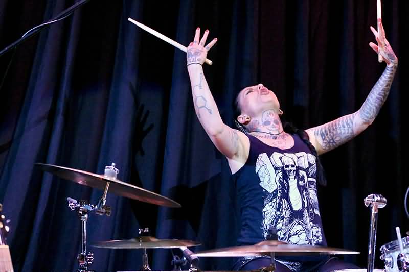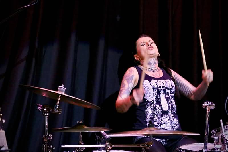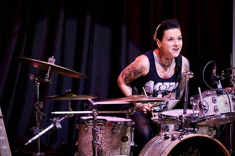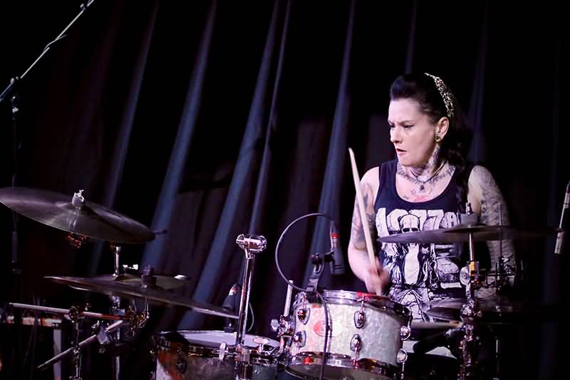 Show-Elemente kamen auch zum Zug. Frank Jäger ließ nicht nur die besonders dicken Saiten seines klasse designten Tieftöners schnurren, nein, er kletterte auch noch in turnerischer Eleganz auf sein Arbeitsgerät. Claudia Lippmann war der dynamische Aktivposten auf Fellen sowie Becken.
