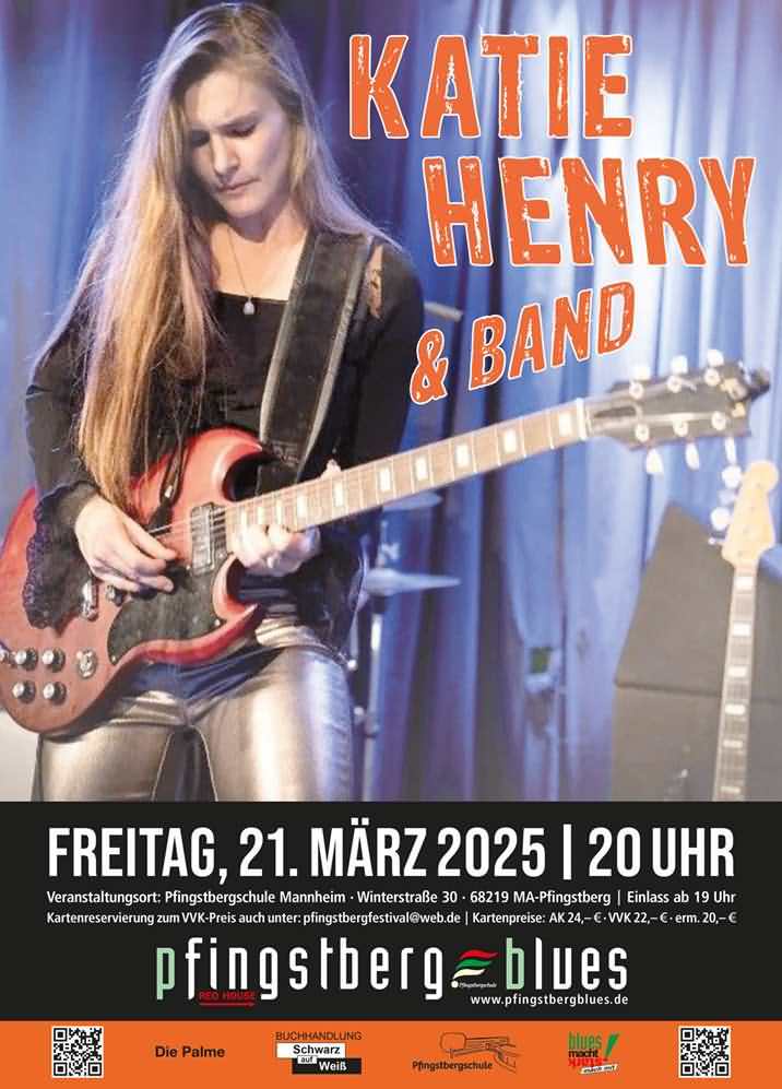 Am 21. 03. 2025 um 20 Uhr wird in der Pfingstbergschule in Mannheim die amerikanische Blues- und Blues Rock- Koryphäe Katie Henry das Publikum auf Touren bringen.