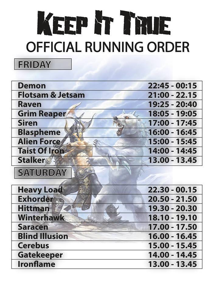 Für das Keep It True XXI, das am 27./28.04.2018 in der Tauberfrankenhalle Lauda-Königshofen stattfinden wird, gibt es wieder ein Update, wenn nichts mehr dazwischen kommt, dann ist das die finale Info. Die Running Order wurde verkündet, siehe Bild: