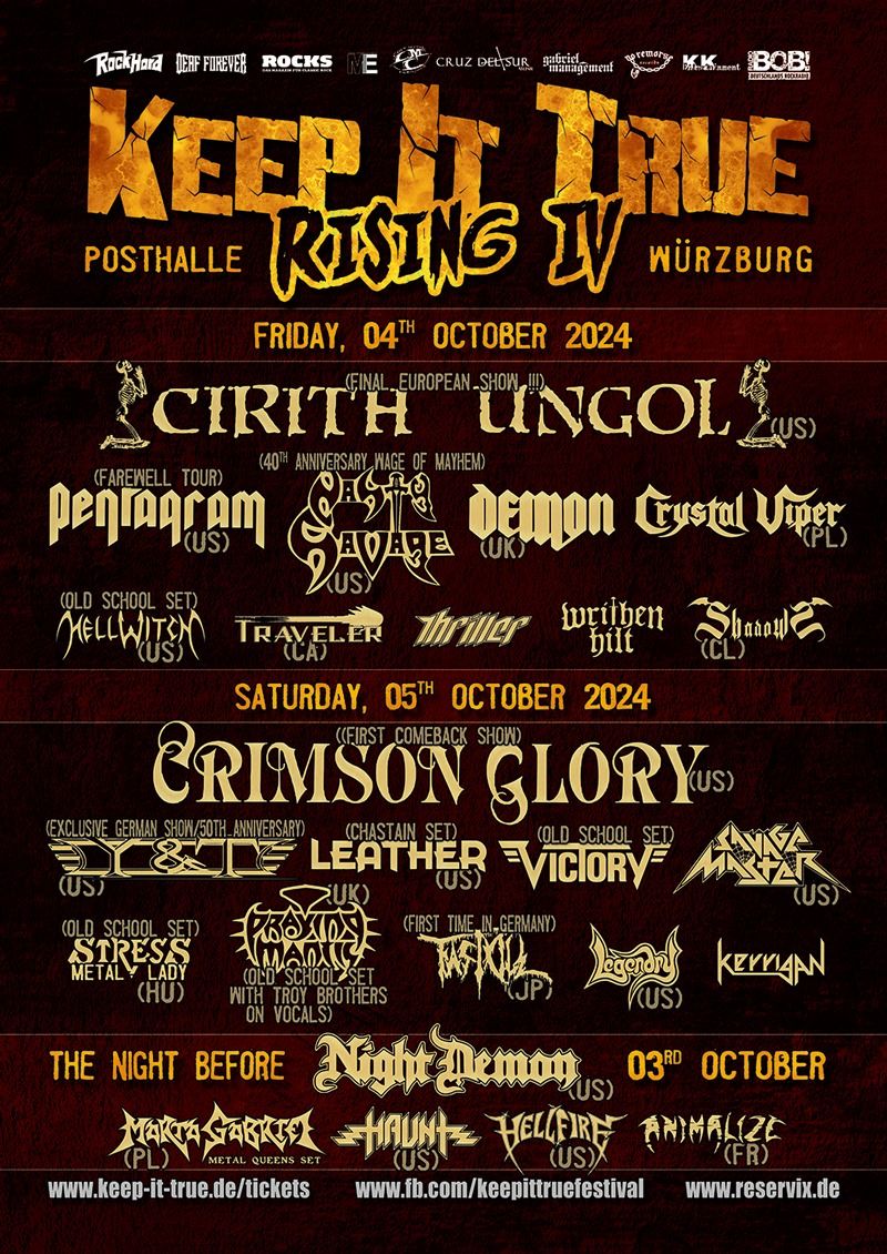 Für das vierte Keep It True Rising, das am 04. und 05.10.2024 (bzw. The Night Before am 03.10.2024) in der Posthalle Würzburg stattfindet, wurde nun der erste Headliner bekannt gegeben, es handelt sich um das finale Deutschland-Konzert von Cirith Ungol (womit sich ein Kreis zum ersten Auftritt in Europa schließt), die angekündigt haben, nicht mehr zu touren.
