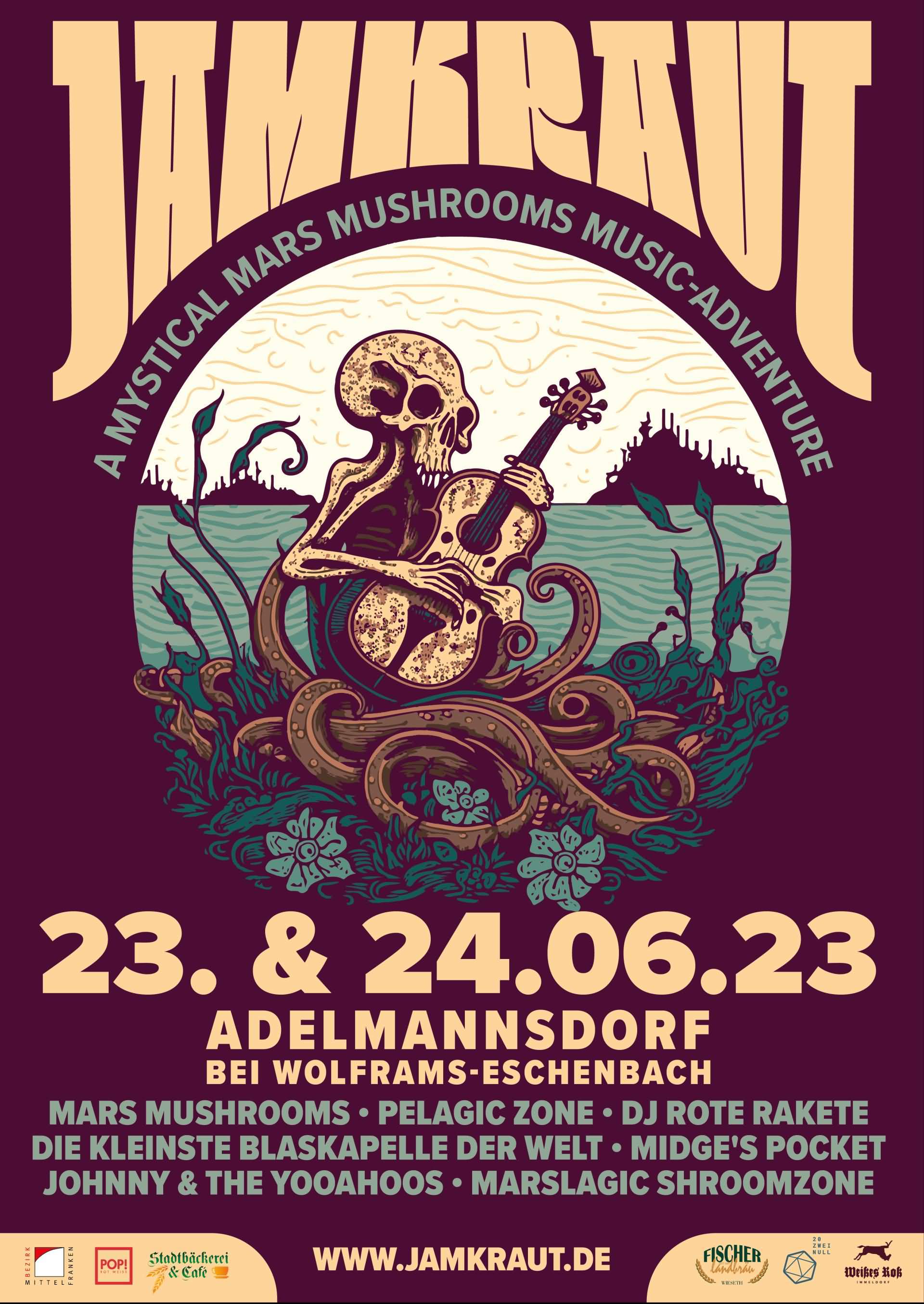 »Am 23. und 24. Juni 2022 veranstalten die mars mushrooms im mittelfränkischen Adelmannsdorf bei Wolframs-Eschenbach im zweiten Jahr ihr neues Festival "Jamkraut". Auch das diesjährige Line-Up spiegelt klar die Handschrift der Band wider und setzt den Schwerpunkt auf spontane Improvisation. "Nach dem gelungenen Auftakt im Jahr 2022 und dem anschließenden überwältigenden Feedback der Besucher war klar, dass Jamkraut zu einer Institution in unserem Bandleben werden muss", so Lars Weißbach (der Tastenmann der mars mushrooms).