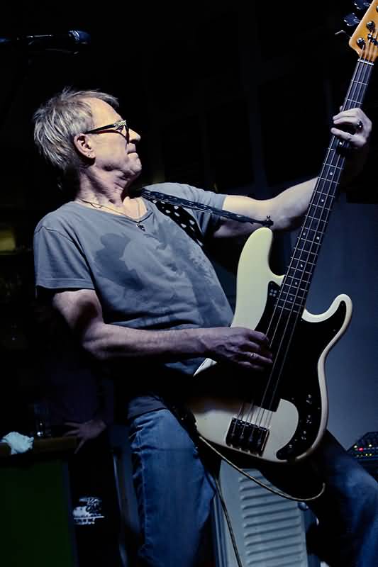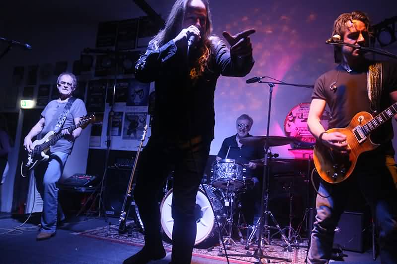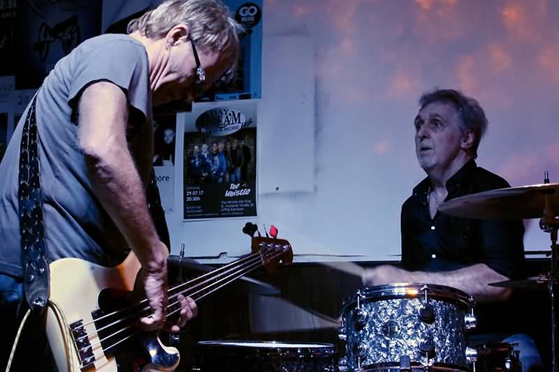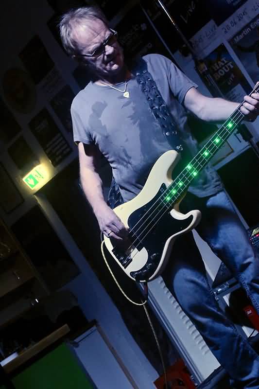 Apropos Groove … "Radar Love" wurde angestimmt, die Leute vor der Bühne tanzten und Flinkefinger Kai Sonnhalter machte sozusagen den Abflug in die eigene Sichtweise auf den niederländischen Klassiker. Martin Engelien servierte ein Basssolo mit im wahrsten Sinn des Wortes erhellenden Elementen, denn er schaltete das grüne Licht an seinem Tieftöner an. Perfekt! Als ein weiteres Go Music-Merkmal entpuppte sich der Hang zu extensiven Song-Finalen. Dieses Quartett förderte Perlen der Rockmusik zutage und stellte sie mit individuellen Prägungen zur Freude des Publikums zur Verfügung.