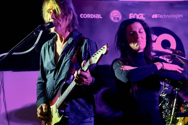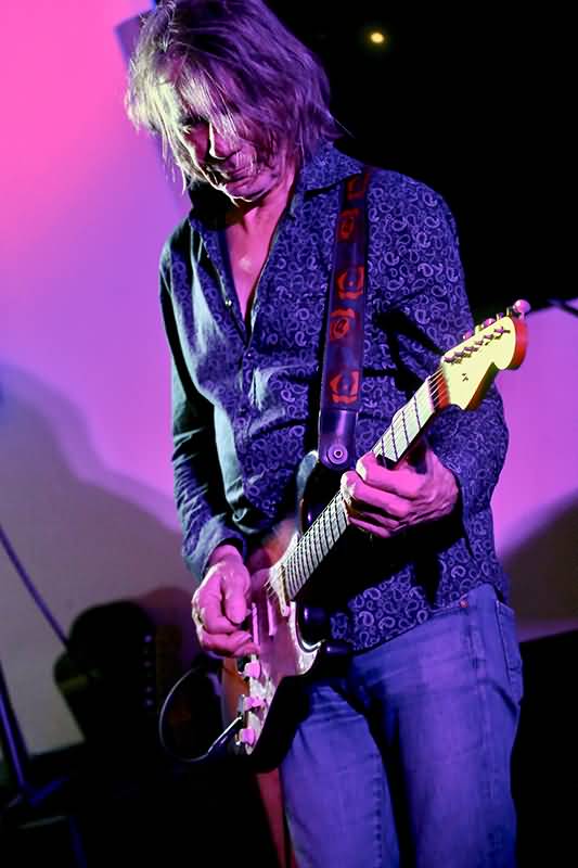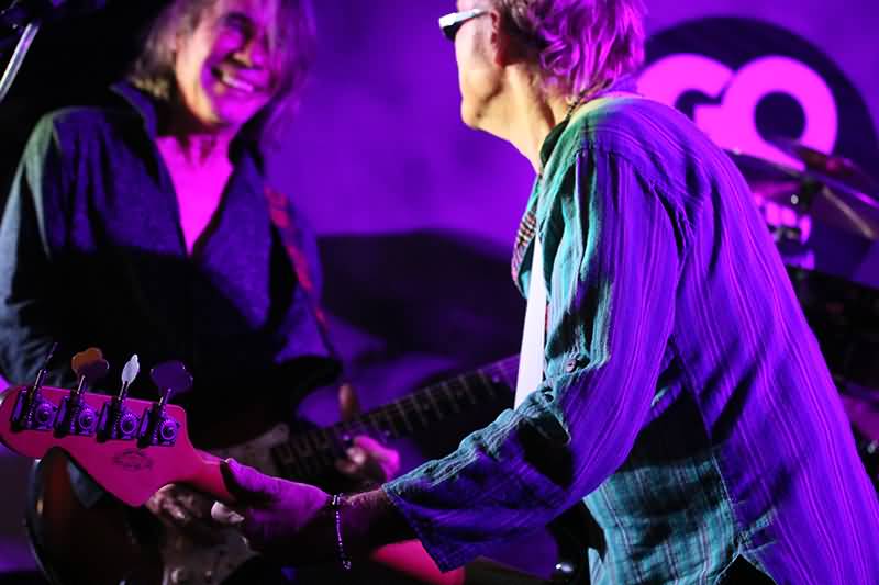 Ob rockend oder relaxt, Martin Ettrich glänzte bei allen seinen Alleingängen. Klasse war natürlich auch sein Einsatz der Talkbox. Peter Frampton hat sich auch über diesen besonderen Sound einen Namen gemacht. "Into The Sky" startete eher gediegen. Der Gitarrist rockte im Überflieger-Solo. Beide Daumen hoch auch für die Go Music-Version von Birth Controls "Gammy Ray". Stella Tonons Gesang wurde in Klangeffekte eingebettet und bei dieser Nummer kam es zu einem Percussion-Futter mit Schellenring sowie Cowbell. Toll! Im Orient-Express führte die Go Music-Reise auch in psychedelische Partien. Dafür sorgte der "White Rabbit". Martin Ettrich sprühte vor Spielfreude und servierte dem begeisterten Publikum auch ganz schön lange Exkursionen auf dem Griffbrett.