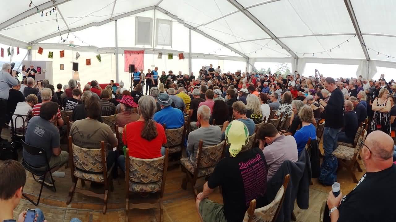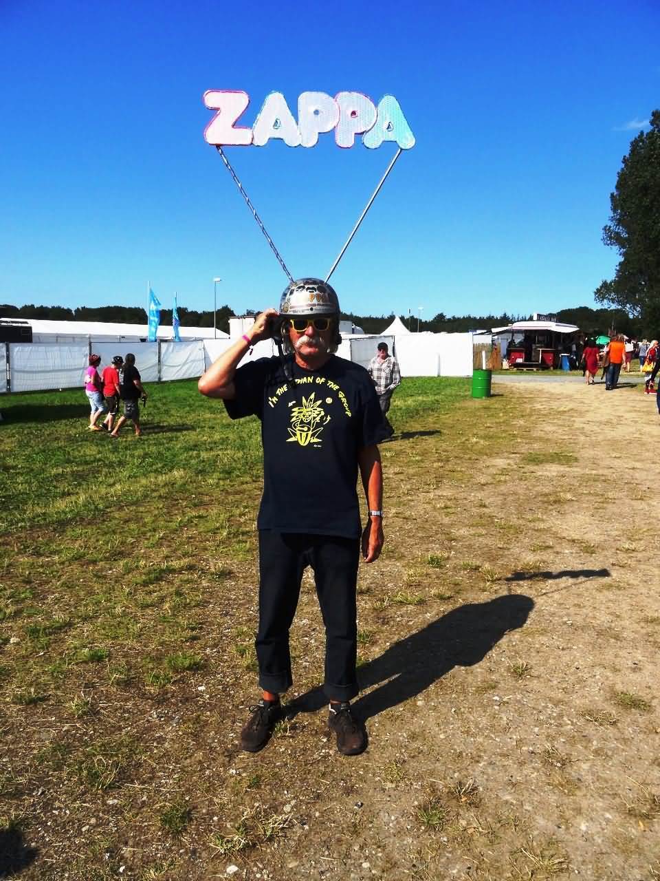 Das Areal, auf dem das Festival stattfand, hat sich gegenüber dem Zeitpunkt meines letzten Besuchs um einige Meter verschoben. Es ist zwar immer noch auf dem Gelände der Pferderennbahn zu Bad Doberan, aber die Hauptbühne ist entsprechend verlegt. Schuld daran waren geheimdienstliche Tätigkeiten anlässlich des G8-Gipfels in Heiligendamm im Jahre 2007. Der BND schien Raum gebraucht zu haben, und man bediente sich der Fläche, auf der zuvor noch auf einer Bühne Zappa zelebriert wurde. Das Gelände wurde umgepflügt, sodass man unter der Oberfläche operieren konnte und Frau Merkel und ihre Gäste auch sicher tagen konnten. Nachdem das ganze vorbei war, war das Gelände wohl für das Festival nicht mehr nutzbar. Nun dient es als Parkplatz. Es ist in diesem Zusammenhang erwähnenswert, dass Zappa das Treiben mit den Worten »Politik ist die Unterhaltungsabteilung des militärisch-industriellen Komplexes« bedacht hätte. Dabei verwendet Zappa den Begriff 'to entertain' streng im Kontext der Kommunikation. Es bedeutet, dass Kommunikation, ihre Wege 'unterhalten', also am Laufen gehalten werden. Damit, und das sagte Zappa deutlich, fielen Diskotheken raus aus der von ihm bevorzugten Kommunikation, vor allen Dingen im musikalischen Raum: »Disco music makes it possible to have disco entertainment centers. Disco entertainment centers make it possible for mellow, laid-back, boring kinds of people to meet each other and reproduce«.[2] Unterhaltungsmusik, Diskotheken-Lala gehören ebenso zu einer Unterabteilung des militärisch-industriellen Komplexes, genauso wie die Politik.