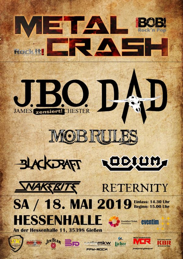 Gießen, 05. Februar 2019. Nach dem von Besuchern und Presse gleichermaßen vielgelobten Debüt im Oktober 2017 geht das Metal Crash Festival in der Gießener Hessenhalle in eine neue Runde und setzt erstmals auf eine Band aus dem europäischen Ausland. Termin ist Samstag, 18.05.2019. Wie auch bei der Erstauflage setzen die Macher wieder auf eine Doppel-Headlinershow. Zu erleben sind keine Geringeren als die dänischen 80er-Hardrock-Heroen von D-A-D und die Erlanger Blödel-Metaller von J.B.O.! Des Weiteren werden die Power-Metaller von Mob Rules ihr 25-jähriges Bandjubiläum auf dem Metal Crash Festival feiern. Ebenso stehen Blackdraft sowie die Trash-Metaller Odium auf dem LineUp-Zettel. Eröffnet wird das Metal Crash Festival von der neuen Combo von Stefan Zörner, Reternity, und der Glamrock-Truppe Snakebite, deren Frontmann Nikki Actionhero aus Gießen stammt und so für entsprechenden Lokalkolorit sorgt.