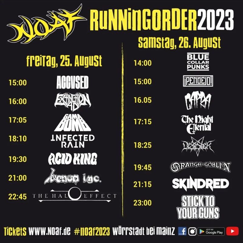 »Die Oldschool-Keule wird beim diesjährigen NOAF von Venom Inc Venom Inc. geschwungen. Es gibt wohl kaum eine kultigere Band als die Urväter des extremen Metal. Die Klassiker "Welcome to hell" oder "Black Metal" sind stilprägende Alben für mehrere Generationen, nicht nur von Bands sondern vielmehr von ganzen Genres. Egal ob Thrash, Black, Speed oder NWOBHM – Venom hat allem seinen Stempel aufgedrückt. Gründungsmitglied "Mantas" und der spätere Sänger "Demolition Man" haben sich nach einigen Kapriolen von der Band abgespalten und zunächst als Projekt M-Pire of Evile gegründet. Nach einem Konzert beim Keep It True 2015 wurde dann Venom Inc. gegründet. Lange dauerte es dann nicht bis zum ersten Album "Avé", der Nachfolger "There´s only black" folgte im vergangenen Jahr. Live selbstverständlich mit allen wichtigen Klassikern ausgestattet, bringen Venom Inc. über 40 Jahre Metal Geschichte auf die NOAF Bühne, ausdrücklich begleitet mit einer amtlichen Show! Wir freuen uns auf einen wahrlich besonderen Auftritt – HEY NOAF«