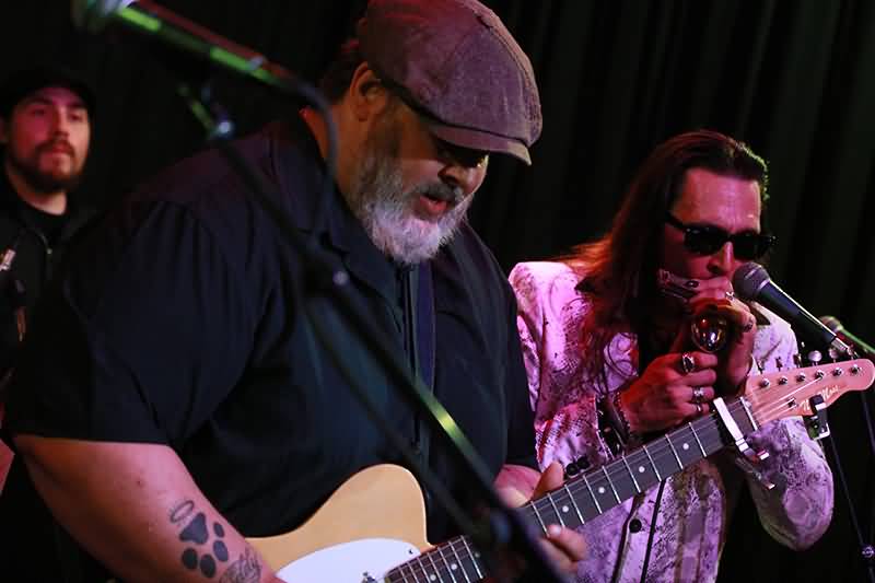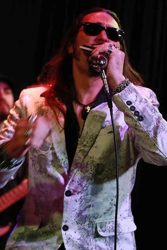 Nach dem Slow Blues konnte man später noch eine Stufe entspannter spielen und Nick Moss servierte dem begeisterten Publikum ein so etwas von butterweichem Solo, dass schon wieder eine Gänsehaut entstand. Das vorher angesprochene musikalische Umfeld wurde noch durch den Boogie erweitert. Hier hatte Taylor Streiff seinen großartigen Boogie Woogie-Auftritt und nach einem Kopfbedeckungstausch mit einem Zuschauer motivierte ein Nick Moss-Solo Dennis Gruenling zu einer feinen Tanzeinlage. Ganz allgemein war dieser Mann vor Bewegungsdrang kaum zu stoppen und zauberte bei seinem Harp-Einsatz auch noch Zitate von Song-Klassikern aus seinem nicht vorhandenen Hut.