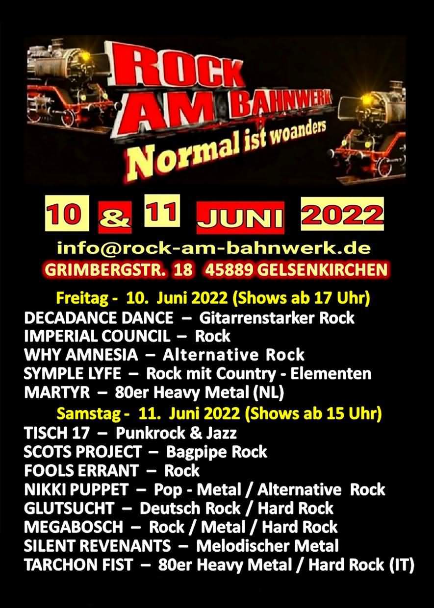 »Nach zwei pandemiebedingten Verlegungen findet am 10. Juni und 11. Juni 2022 endlich wieder das Rock am Bahnwerk Open Air vor historischer Kulisse auf dem großen Bahnwerksgelände in 45889 Gelsenkirchen-Bismarck, Grimbergstr. 18 statt!«