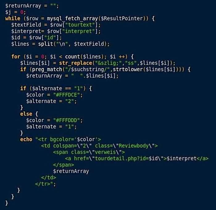 Aber das Schreiben, Abfragen/Anzeigen und Ändern der Datensätze musste über die Scriptsprache php erfolgen und das hieß für mich, diese Sprache soweit zu erlernen, dass wir es für unsere Website gebrauchen konnten. Jede gewünschte Funktion musste selbst programmiert werden, aber es hat dann doch funktioniert. Ich war ja noch berufstätig mit limitierter Zeit. Hier mal als kleines Beispiel ein Array im php-script, das die Datenbank durchläuft und alle Datensätze anzeigt, die dem Suchmuster entsprechen. Nur das Array, der Rest ist dann doch zu umfangreich, um es hier zu zeigen.