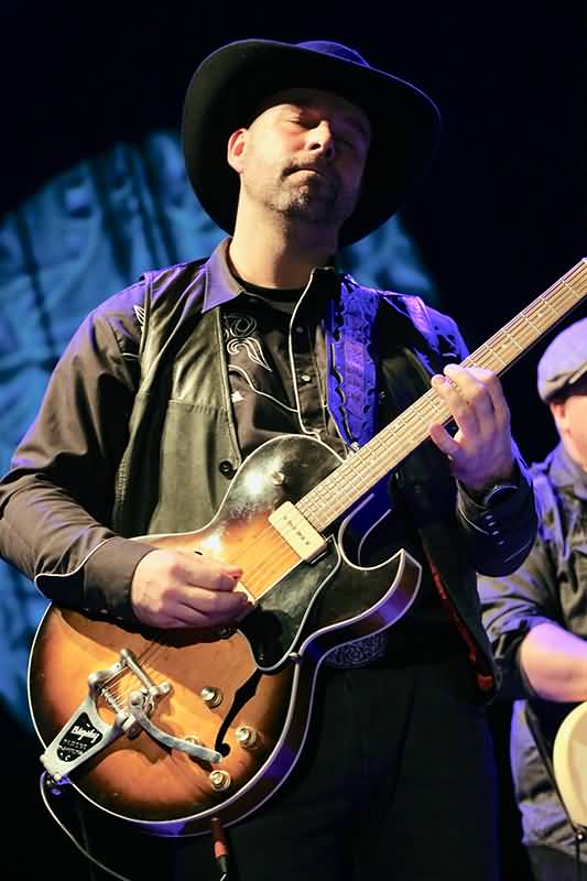 Der singende Bassist punktete nicht nur mit seiner Dynamik auf den dicken Saiten, sondern auch durch seine raue Stimme, die sowohl zur verlangsamten wie auch flotten Version des Zwölftakters passte. Außerdem spickte man den Auftritt mit Gitarren- beziehungsweise Harp-Soli. René Niessen und Luc Boonen gaben sich da reihenweise die Einzelaktionen-Klinke in die Hand, spielten in tollen Frage-Antwort-Situationen oder unisono zusammen. Feeling und Virtuosität sorgten für Szenenapplaus. Klasse!