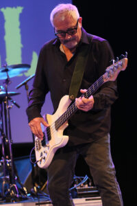 Sinnbildlich machte der Mann beim Gehen von links nach rechts und zurück, mal einem Stopp bei Sean Chambers einlegend, gefühlt echt Kilometer auf der ausladenden Bühne. Seinem Basssolo gab er durch Slapping einen funky Kick und er zeigte dem Publikum auch, dass er auf den dicken Saiten seines weißen Tieftöners ebenfalls jazzig unterwegs sein konnte. Auch hier beide Daumen hoch für Pat De Salvo für sein exzellentes Bass-Spiel.