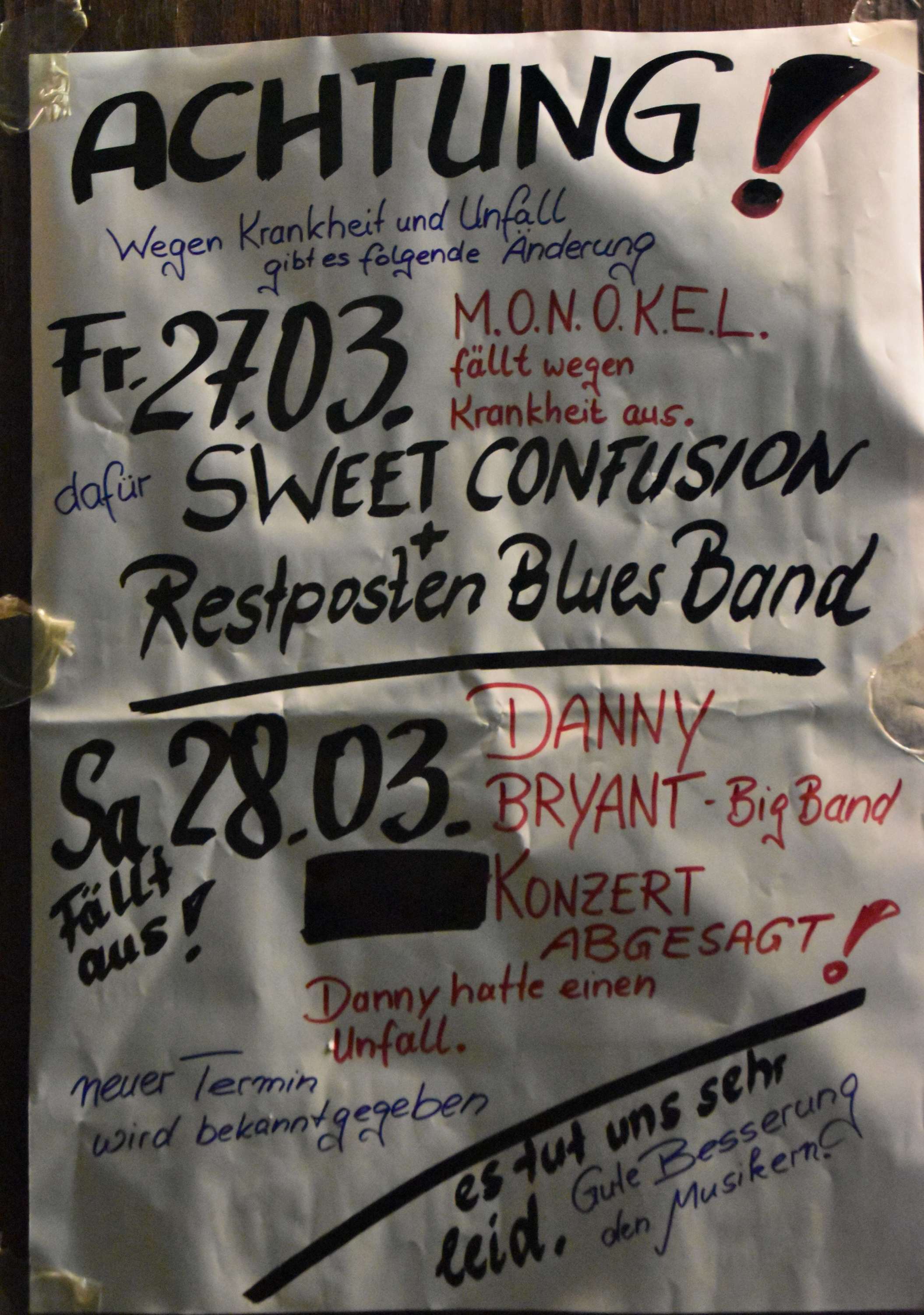Was Dirk Pasold innerhalb von wenigen Stunden für den Freitag gelang, sollte am Tag darauf ausbleiben. Das Konzert mit der Danny Bryant-Bigband musste kurzfristig abgesagt werden, weil der Bandchef einen Unfall erlitten hatte, der ihn zum Pausieren zwang. Ein Ersatztermin muss erst gefunden werden. »Gute Besserung den Musikern«, schrieb Dirk Pasold auf ein Plakat.