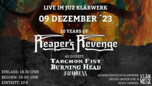 Mit Brainless und Burning Head supporten Tarchon Fist die Heavy Metal-Thrasher Reaper’s Revenge am 09.12.2023 im Jugendzentrums Klärwerk in Amberg (Bayern). Dort feiern Reaper’s Revenge ihr 10jähriges Bandjubiläum.