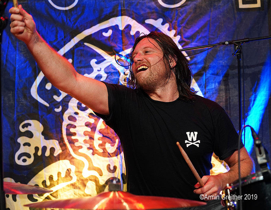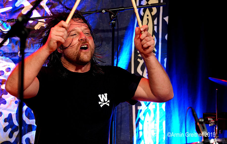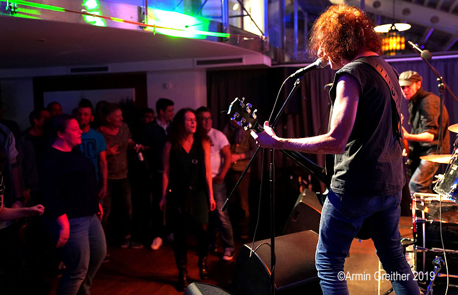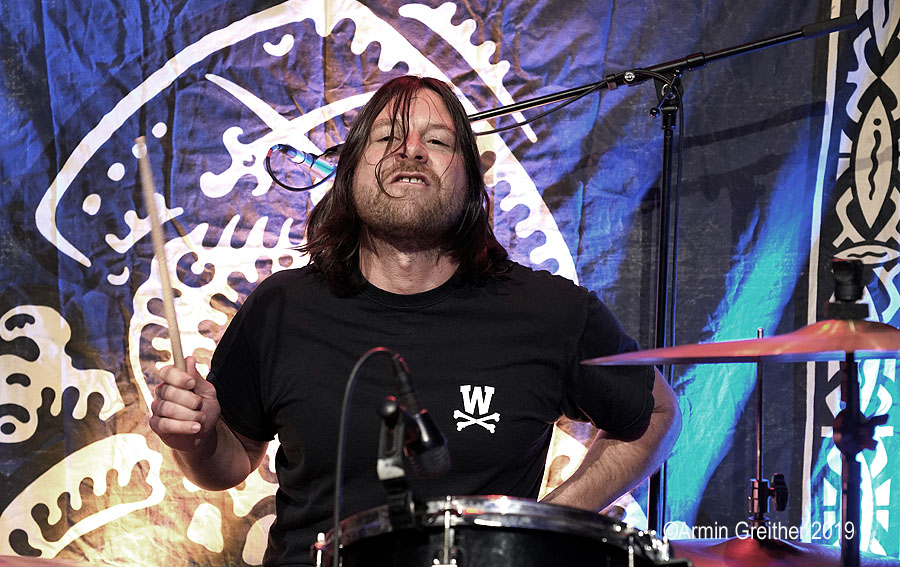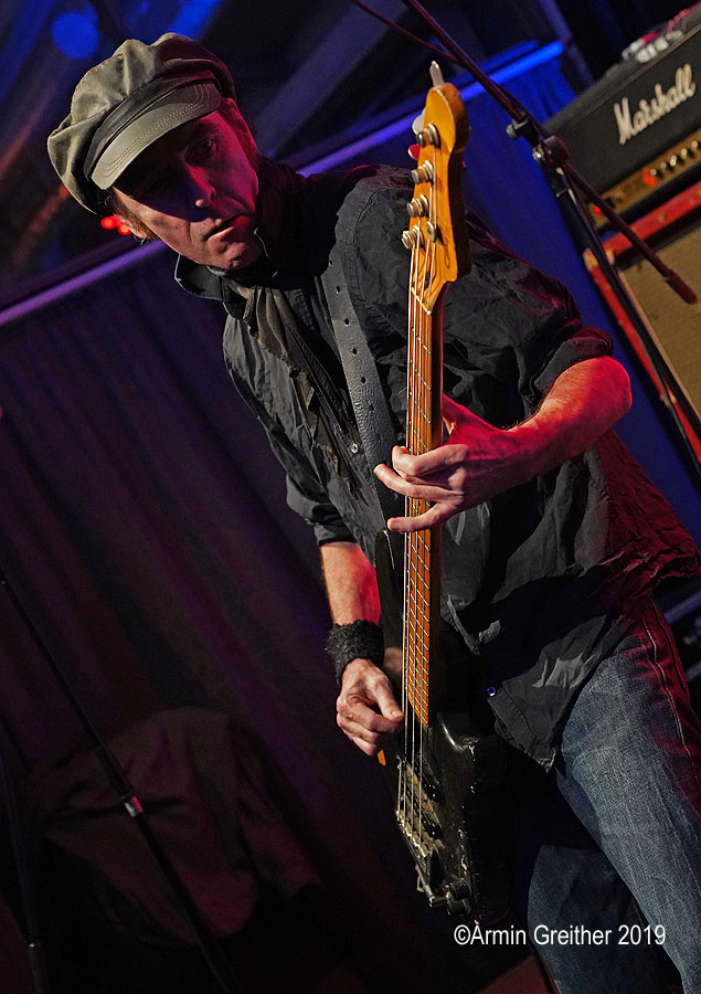 'Let’s go, let’s do it', so das Motto der Truppe und los ging es mit Garage-Punk’n’Roll mit Surf- und Punkelementen. Alles krachend und auf den Punkt gespielt. The Stooges, Ramones und Link Wray waren in den knackigen Rocksongs zu erkennen und es gab keine Verschnaufpause für die 100 Besucher. Von Beginn an war Party angesagt und auch das Alter der Bandmitglieder bremste nicht die Wucht des Auftrittes. Immerhin ist die Gruppe seit 30 Jahren unterwegs und der Gitarrist und Sänger Tony Thomas hat die 60 Jahre Lebensalter auch schon überschritten. Das Fundament legten Powerbündel Olivier Joliat am Schlagzeug und der grimmig schauende Bassist Pascal Sandrin. Die sympathischen Musiker sind aus Basel und in der schweizerischen Liveszene eine große Zugnummer in den dortigen Clubs.