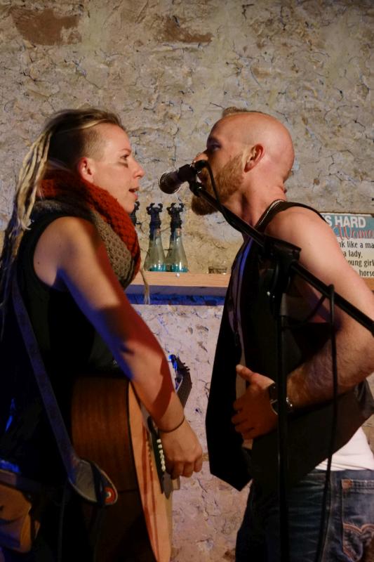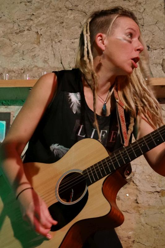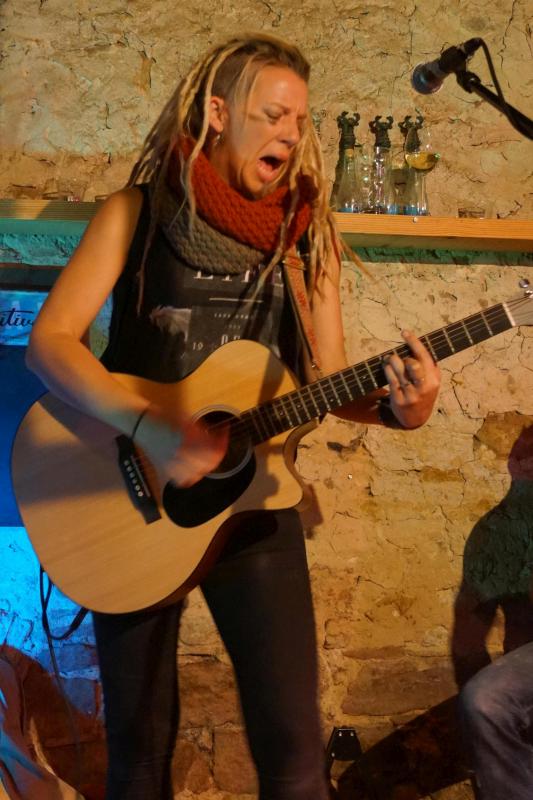 Über Toby und ganz besonders ihre Konzerte in Franks Bodega haben wir ja schon mehrfach berichtet. Die Australierin gab dort vor fünf Jahren ihren Einstand. Seitdem war sie mehrfach in dieser schönen Location mit dem ganz besonderen Flair, dem leckeren Essen und dem guten Wein, aufgetreten. Im Frühjahr und Herbst 2013 schrieben wir über die Konzerte, weitere hatten wir privat besucht. Jede Toby-Tour ist anders, was schon allein daran liegt, dass sie in wechselnden Besetzungen unterwegs ist. Diesmal war für uns die große Unbekannte die Bassistin Caroline Kamp, denn Tom Clarke, der sonst die dicken Saiten zupft, war diesmal leider nicht dabei. An der Percussion war wie schon im Herbst 2013 der Niederländer Josse Sharrard und auch Harmonika-Spieler Jean-Guy Lemire war uns von diesem Gig noch in guter Erinnerung. Das Set war in der Bodega rein akustisch angelegt, was sehr gut in diesen Rahmen passte. Obwohl Toby zwei Tage zuvor nur wenige Kilometer entfernt am Lambsheimer Weiher gespielt hatte, war die Bodega gut besucht.